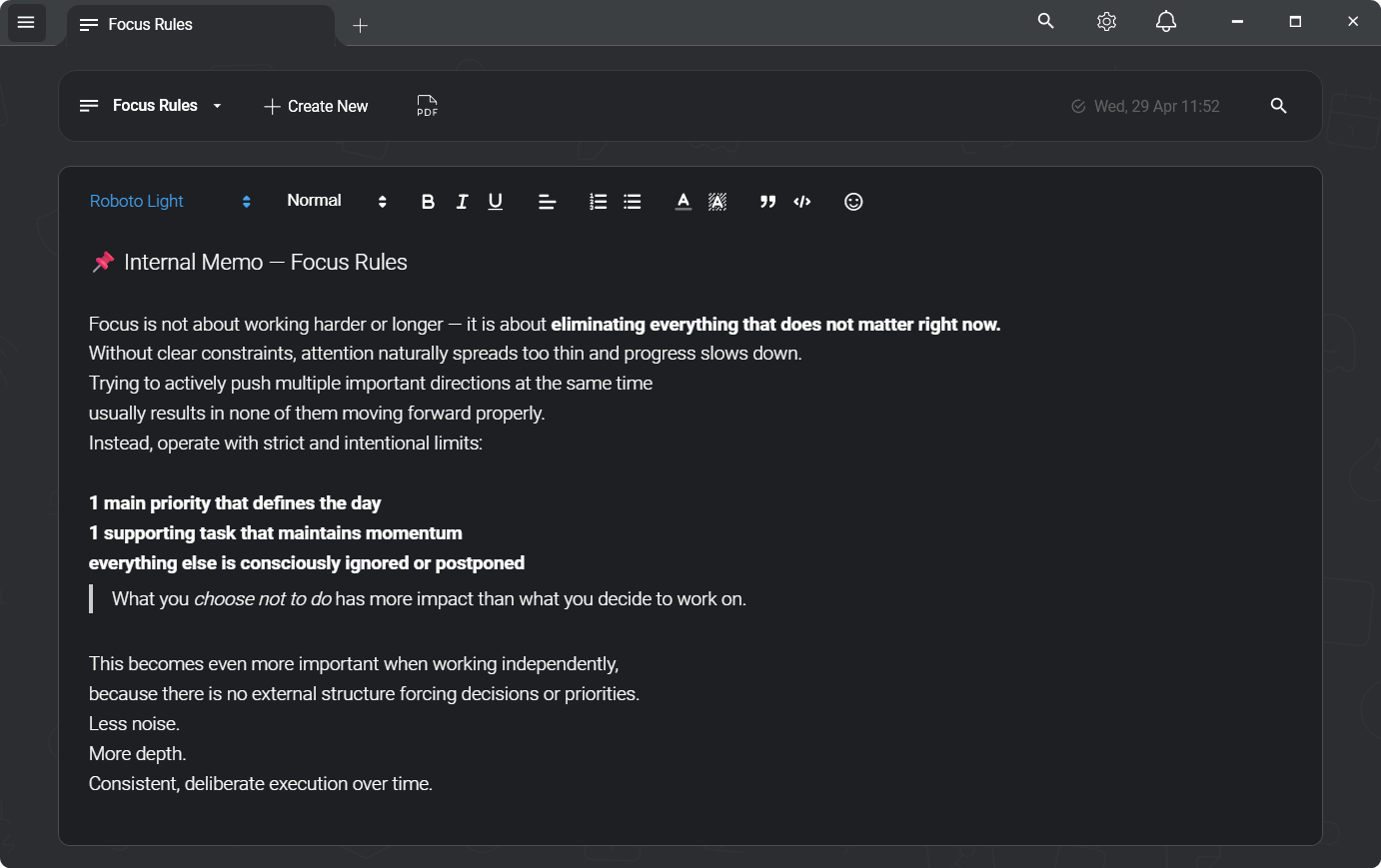 Native shell, rich editor. Headings, ordered and unordered lists, code blocks with syntax highlighting, inline images, hyperlinks, blockquotes. Multi-tab workspace — open several notes simultaneously, switch instantly, open a note in a new tab with a middle-click or a button.