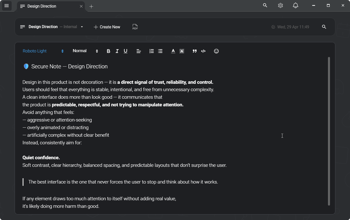Removing cloud sync does not mean removing features. Snoq has a full rich text editor — headings, lists, code blocks, links, inline images, 9 font choices — plus multi-tab workspace, full-text search across all your notes, note categories, starred notes, PDF export, and an encrypted vault backup system.